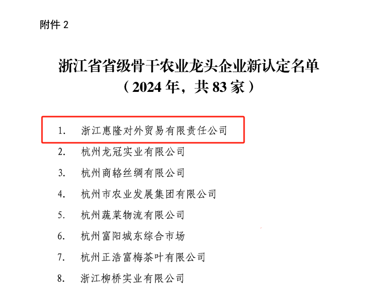 114,省農業農村廳、省供銷社、省糧食物資局、省林業局四部門聯合印發通知,新認定浙江惠隆對外貿易有限責任公司等83家企業為省級骨干農業龍頭企業。